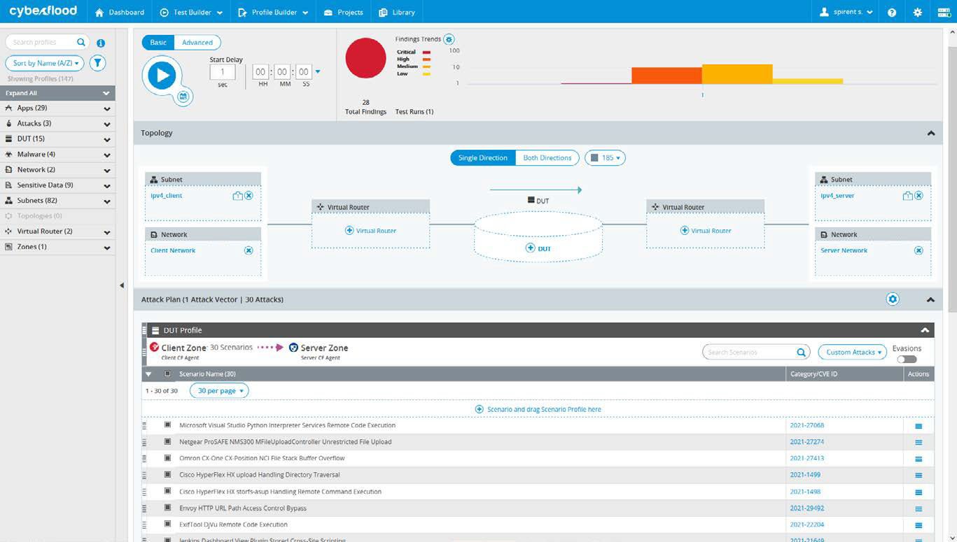 Security Testing—find and fix vulnerabilities quickly. The Spirent CyberFlood security testing options provide users an effective means to test with a database of tens of thousands of up-to-date application, attack, and malware scenarios. This allows you to mix attacks and applications to verify and analyze network security. You can add realistic hacker behavior with evasion techniques or encrypt attacks to push security solutions to their limits. For malware testing, CyberFlood provides infected host emulation, as well as malware binary transfer-based security testing. Plus, you can quickly create custom tests for unique protocols, traffic flows, and applications, without scripting, and leverage smart remediation tools to shorten the time to find and fix vulnerabilities.